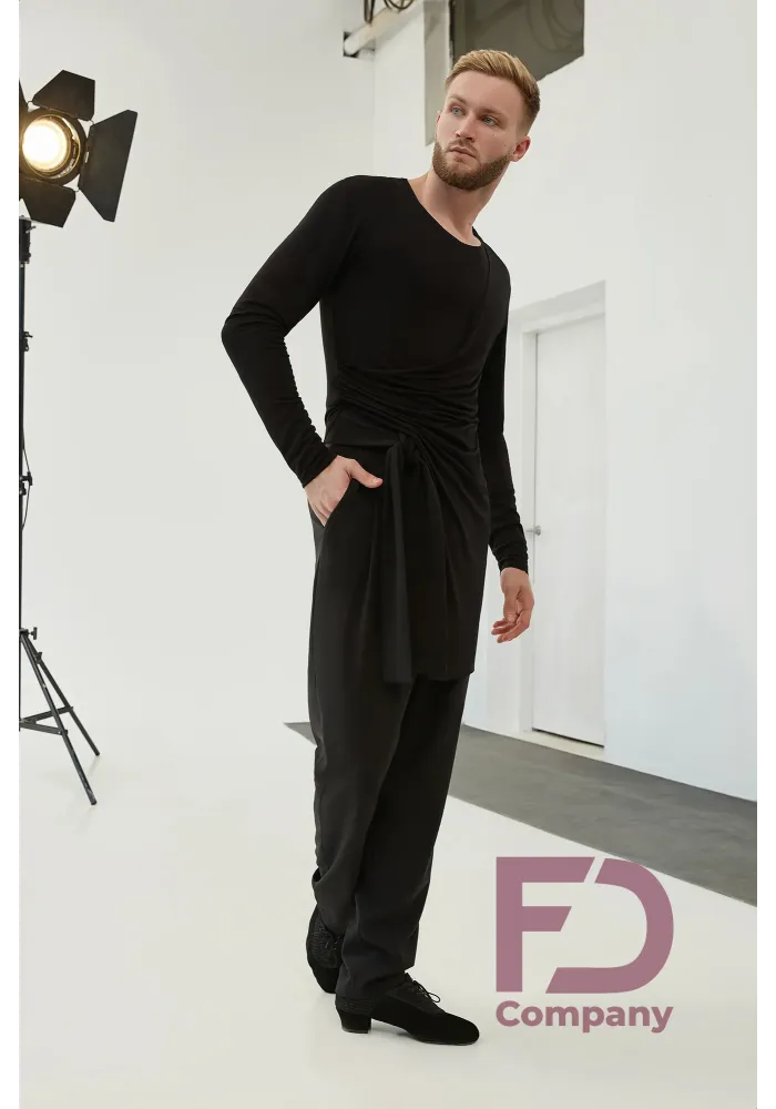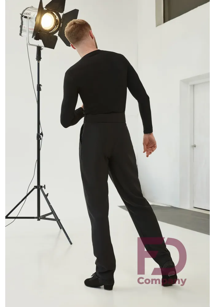 Men's trousers with a high waist, with pockets, tapered to the bottom. The belt is wide, fastens with hooks, completed with a belt - a tie. Warehouses have been processed on the front. The product is made of dense gabardine.
